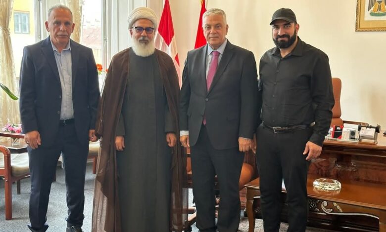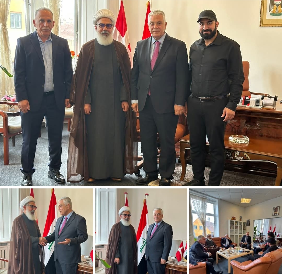 التقي الوزير المفوض السيد (حيدر راضي ناصر الشمرتي) بسماحة الشيخ (محمد فاضل الكعبي) رئيس مؤسسة شباب القاسم (ع) والسيد ( خالد لطف علي الفيلي ) متهد بنقل الزائرين والسيد (عبدالرسول رضا الربيعي) مدير مكتب الخطوط الجوية في مقر السفارة العراقية / كوبنهاكن صباح يوم الثلاثاء الموافق 22/07/2025 وجرى اللقاء المقابلة بطلب من قبل ابناء الجالية العراقية في كوبنهاكن .