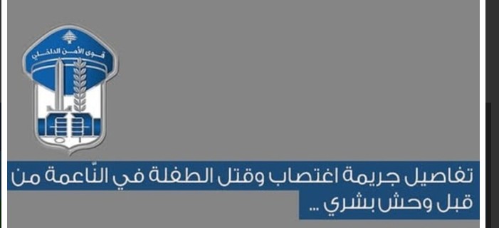 قوى الداخلي الأمن اللبنانية: كشف ملابسات ​جريمة اغتصاب​ وقتل ابنة العشر سنوات